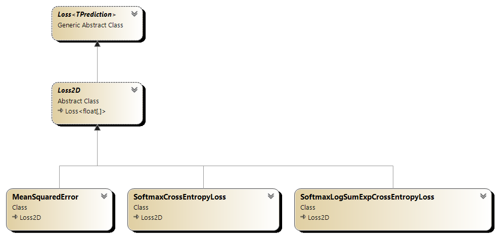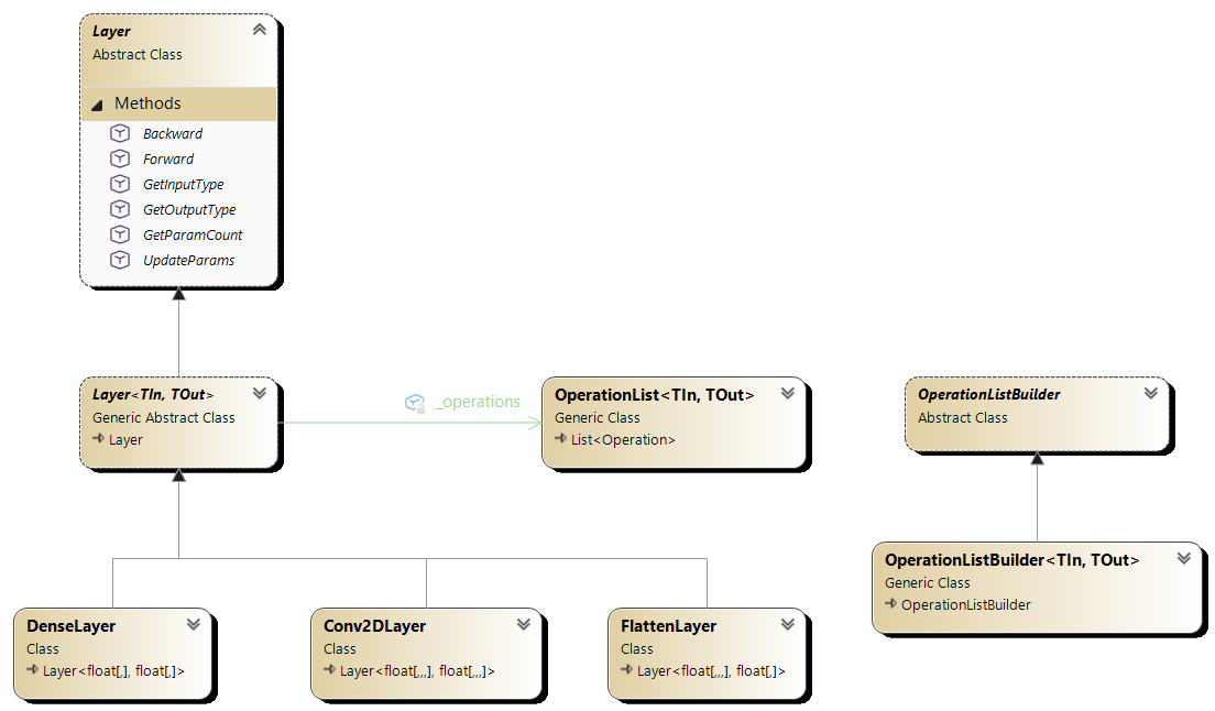 Biblioteka zawiera szereg gotowych warstw sieci neuronowych, zdefiniowanych jako klasy dziedziczące po abstrakcyjnej klasie Layer<TIn, TOut>.